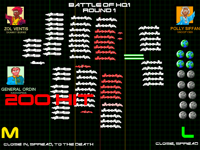 The third round of combat saw a simultaneous exchange of laser, in which Polly's maneuvered ships finally succumbed to the General's superior numbers. 15 bases were captured. One of Ordin's lasertitans also required major repairs.Visit First Cultural Industries