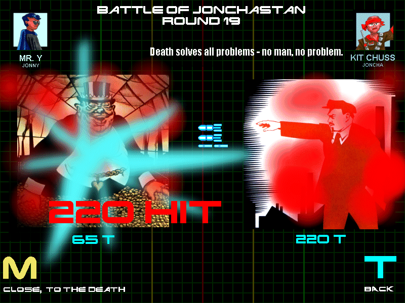 Here comes the onesided beatdown wave. joncha lands a 220 hit and a 440 hit, which is more than enough to kylle all Jonny's stuff several times over.