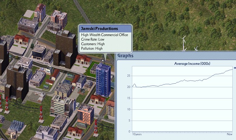 • Finally, the area around Smiley New Town has been grown into a real subcity, with a downtown business area of its own. Resident incomes are on the rise, and demand in all sectors except high wealth residential and offices remains strong.