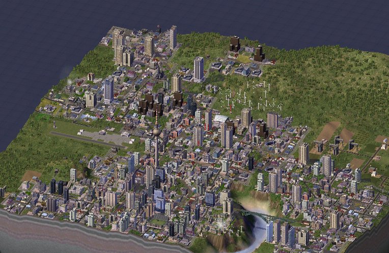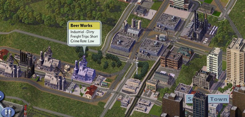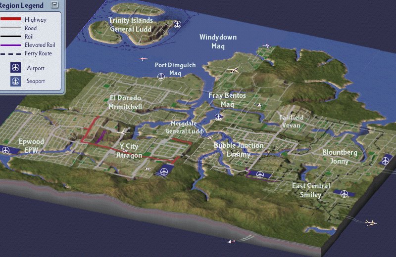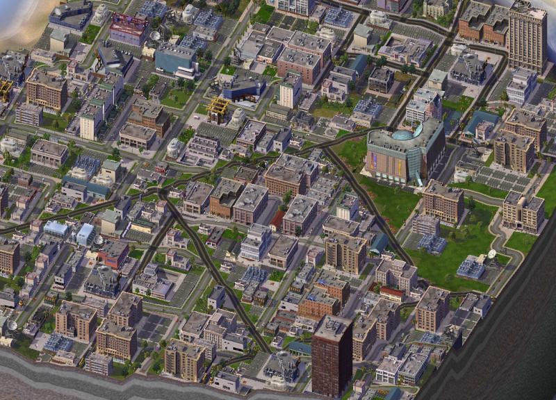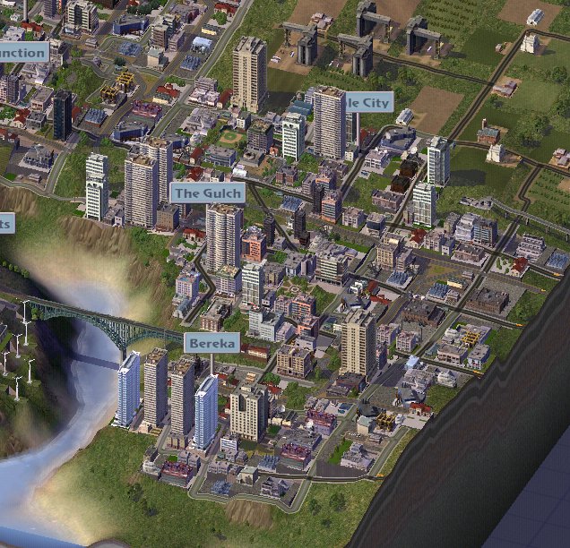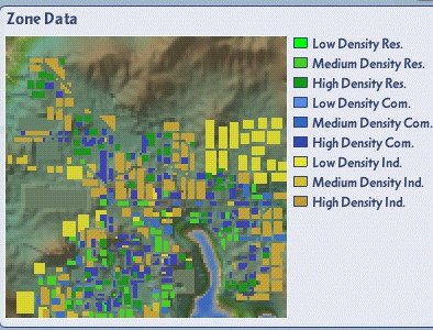 Zoning map. Development is working its way up the main railroad, and is filling in the gaps between the satellite cities to form a continuos urban fabric. Most remaining downtown farms are now growing microchips and spaceship parts for future Galatic Overlording.