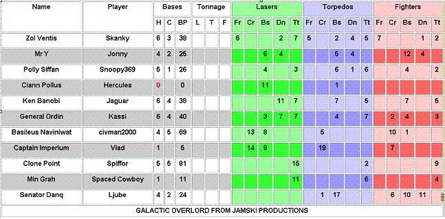 Here's the table (twice) of the current positions. Thank you for showing great attacking at last Perhaps one of you MIGHT be worthy of the title Galactic Overlord. Herc - note you MUST capture a base this turn.