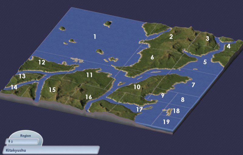 Alternately, here's another region with hills and lots of water, all medium cities (an 8x8 grid of them). Hasn't been rendered yet, so mucking around with city sizes wouldn't be that hard.
