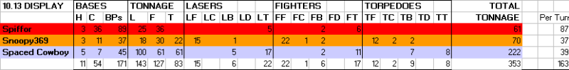 All orders must contain ALL of the following elements, in order to be considered valid. Any missing element risks an automatic loss in the event that element was needed. 1. Build orders. If none are present, StockpileBPs is assumed. 2. Home Defensive OOB. A missing Home Defensive OOB results in an automatic loss if you are attacked. You may specify a "Default OOB" to the GM ahead of time to avoid this. 3. Special Order. This consists of: A) Train Spy B) Build Shield C) Attack < Player X > with < Fleet N ([b]All[/b]) >, < Allies L,M >, and OOB < YYY-ZZZ >, < close/[b]default[/b]/back off >, < spread/[b]default[/b]/bunched >, < To the Death or [b]Not To the Death[/b] >, < Attack All Comers or [b]Not Attack All Comers[/b] > D) Allied Defend < Player X > with < Fleet N ([b]All[/b]) >, OOB < YYY-ZZZ >, < close/[b]default[/b]/back off >, < spread/[b]default[/b]/bunched > E) Use Shield 4. Espionage Order. This consists of: a) Spy < Player X > b) Use CounterEspionage Bolded features are considered defaults and will be used if not specified. Each element 1.) through 3.) must be present in every valid set of orders.