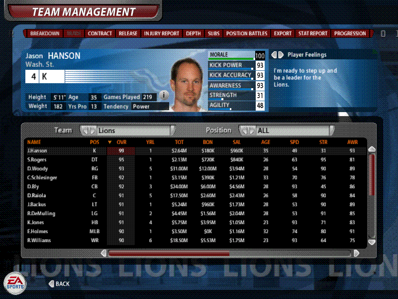 Trailing 32-31 with 1:29 left in the Thanksgiving game, my Lions prevailed on a 9 yard offtackle TD by Kevin Jones with 8 seconds left. (I had one more timeout in the bank, hence the attempt at a TD as opposed to a FG.)