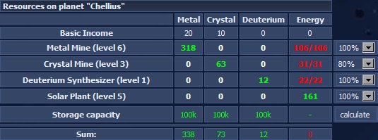 Anyway, version 2 of my spreadsheet. It calculates production for various building combinations, simply enter the building level and the production %. Also added is a time calculator - how many minutes until you have enough resources for the next building.