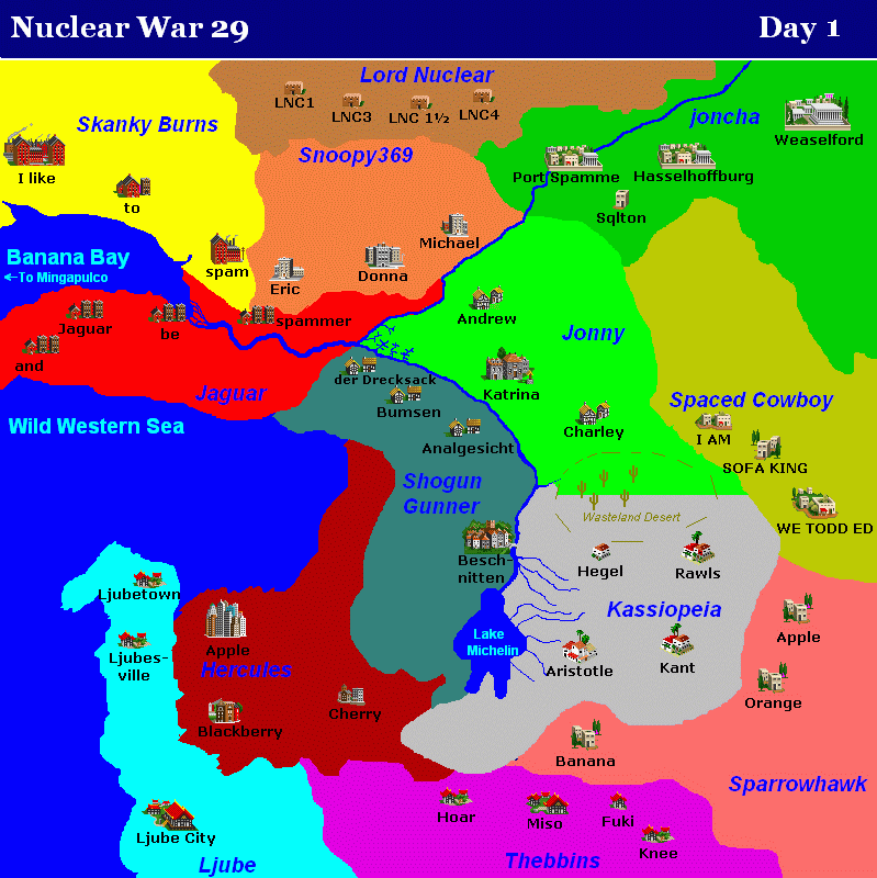 Some new cities were built on the first turn after the H-Bomb accident: Kassiopeia used the money he gathered from International Red Cross donations to build a new city, or rather a refugee camp for the victims of the Blast, calling it Hegel. Thebbins built the Japanese-styled city of Fuki near the Sparrow-Thebbins border. Shogun Gunner decided to use the river fork as a construction lot for a future metropolis called der Drecksack. Lord Nuclear built the city of LNC4, joncha the city of sqlton, and Jaguar the city of and.