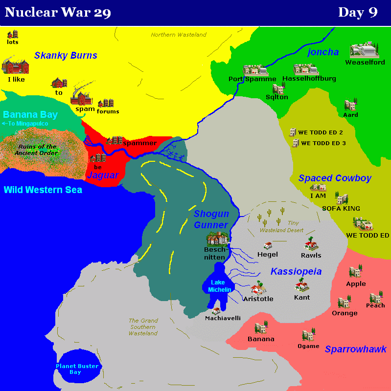 It be a quiet day... well, it was supposed to be, until Spaced Cowboy decided to send his orders: four warheads were launched towards Shogun Gunner with a spy. Spy met another spy along the way, since Jaguar had also used one of his spies. After sabotaging Shogun's orders, they enjoyed espresso together and talked about their personal lives. Jaguar also built the city of "be". Everyone sent their orders in this time, but all the others had secret projects.