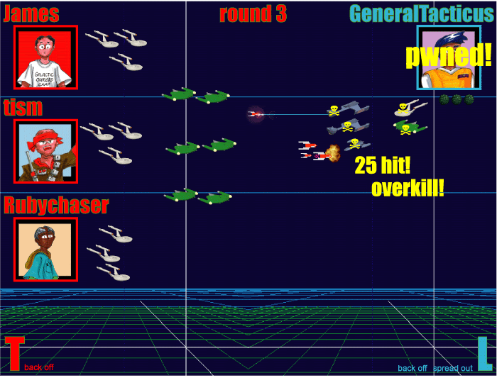 James, Rubychaser, and tism each take one base. Not a single attacking ship is lost.