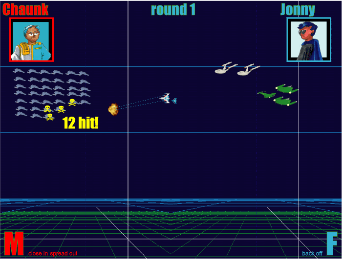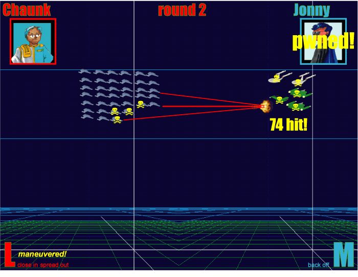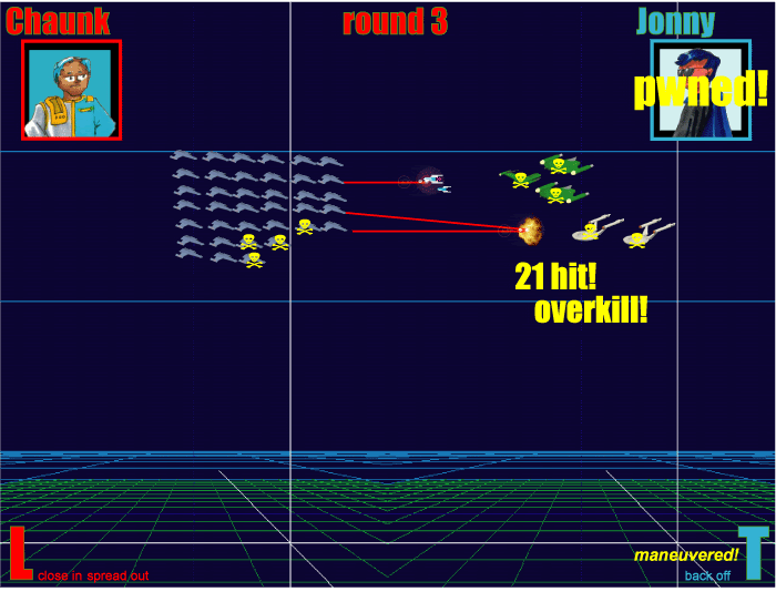 Not even Jonny's maneuvered torpedoes are enough to fend off Chaunk's wall o' lasers. Game over, man.