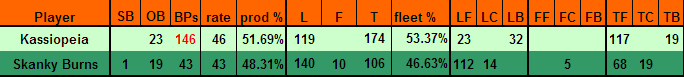 Kassiopeia loses 26 Torpedo Frigates, but gains (per prior arrangement) 23 bases. Skanky Burns loses 25 Torpedo Frigates, but gains a single base. Chaunk fights valiantly, but is eliminated.