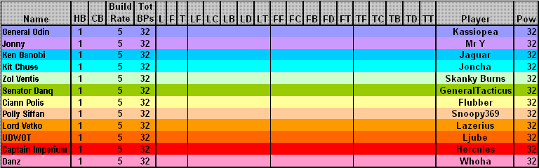 The GM will report each turn on the activities of each player. He will keep their orders secret, but will reveal their bases, the size and breakdown of their navy and their current BPs.