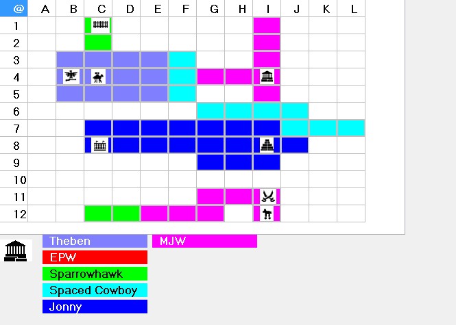 * Jonny constructed 39 Armies, researched tech level 8 (Industrialization), which made the Colosseum Obsolete; built a lot of cities alongside EPW's Empire, and prepared for war.