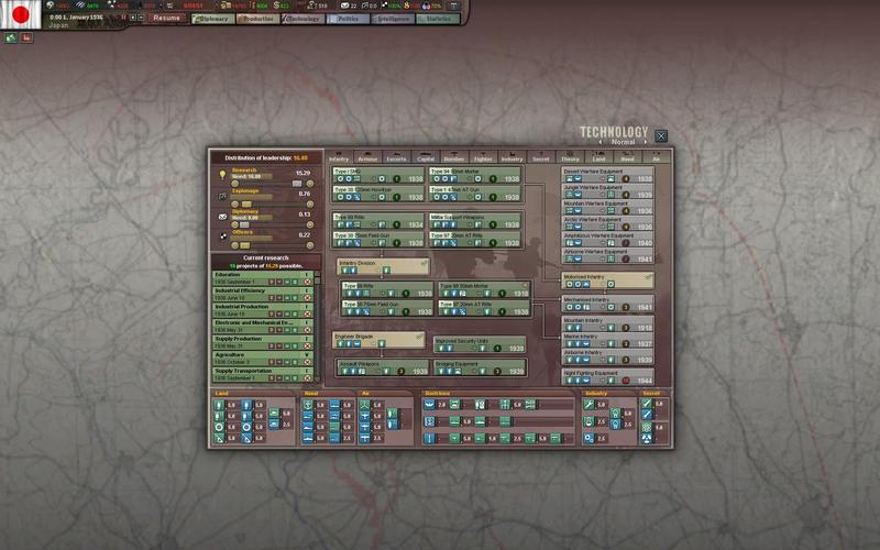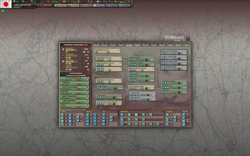 Doctrines + Weapons are of course dependent on the nation, but I am thinking that you will want at least to have a couple of techs going of both doctrine and weapon research in the prime areas of interest for you and at least one in doctrine and weapon research in the areas of lower interest. Probably some nations can mostly skip stuff (like Russia skipping naval?) though.