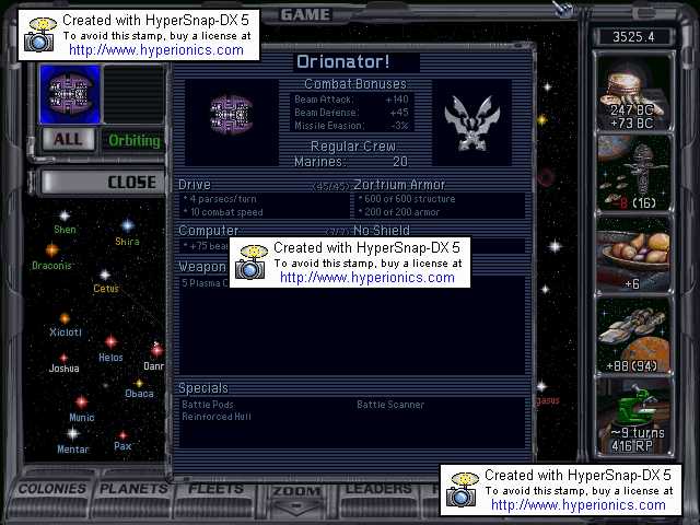 We are 8 turns away from the next technology, and are getting 40 BC per turn. We are now running an 8 cp deficit, from 5 battleships, 1 frigate, and 3 transports. More starbases and battlestations are being constructed though.