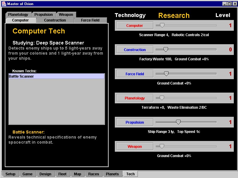This was a fairly complex screen because there are a lot of interactions between the various widgets. Getting the sliders to work in unison was probably the hardest thing, and it wasn't really that hard -- just time-consuming. The "Known Techs" should be a scrolling list once it is populated with enough techs to fill it up. When you select one in the list, its description will show up in the bottom.